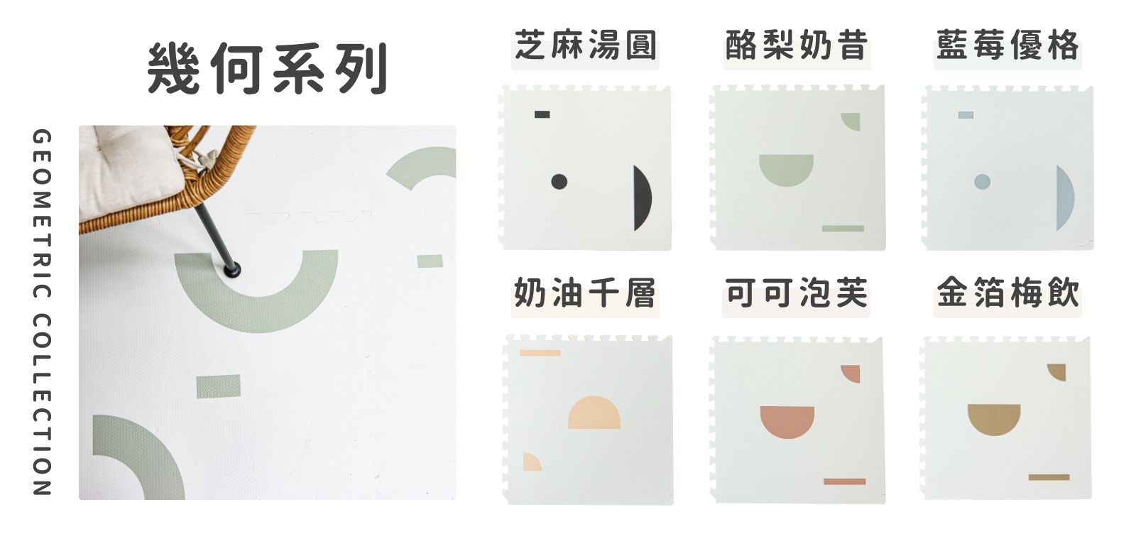 融合了現代感和抽象美學的「幾何系列」巧拼地墊,以多樣化的不規則圖案組成,表達出父母多元的生活方式和孩子們獨特的遊戲觀;其極簡設計與實用功能完美結合,提供柔軟又安全的遊戲空間,同時兼具時尚裝飾感,與家居搭配無縫,為家庭帶來樂趣與安心感。