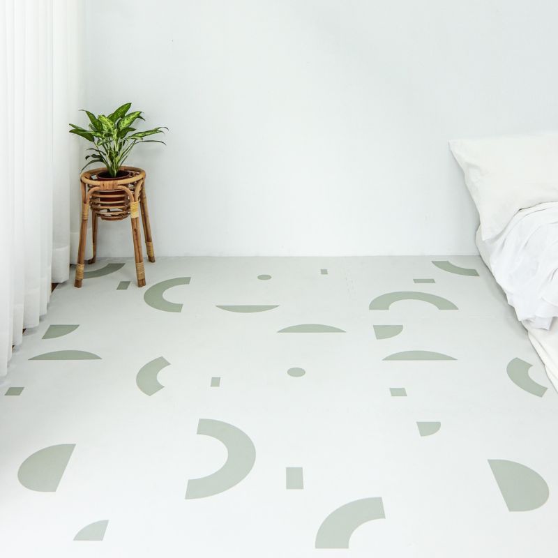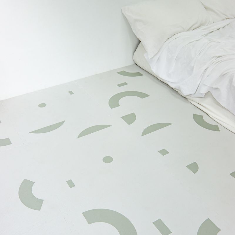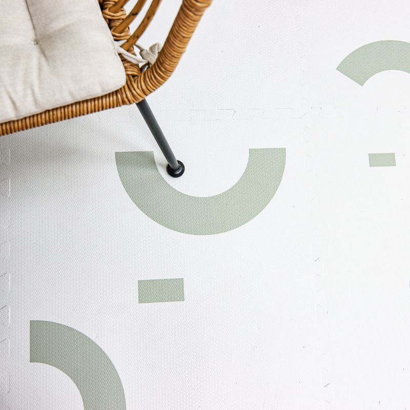 酪梨奶昔」巧拼地墊,融合清新的霧白底色和迷人的鼠尾草綠色幾何圖案,宛如奶昔濃郁的奶白和酪梨的綠意交織。