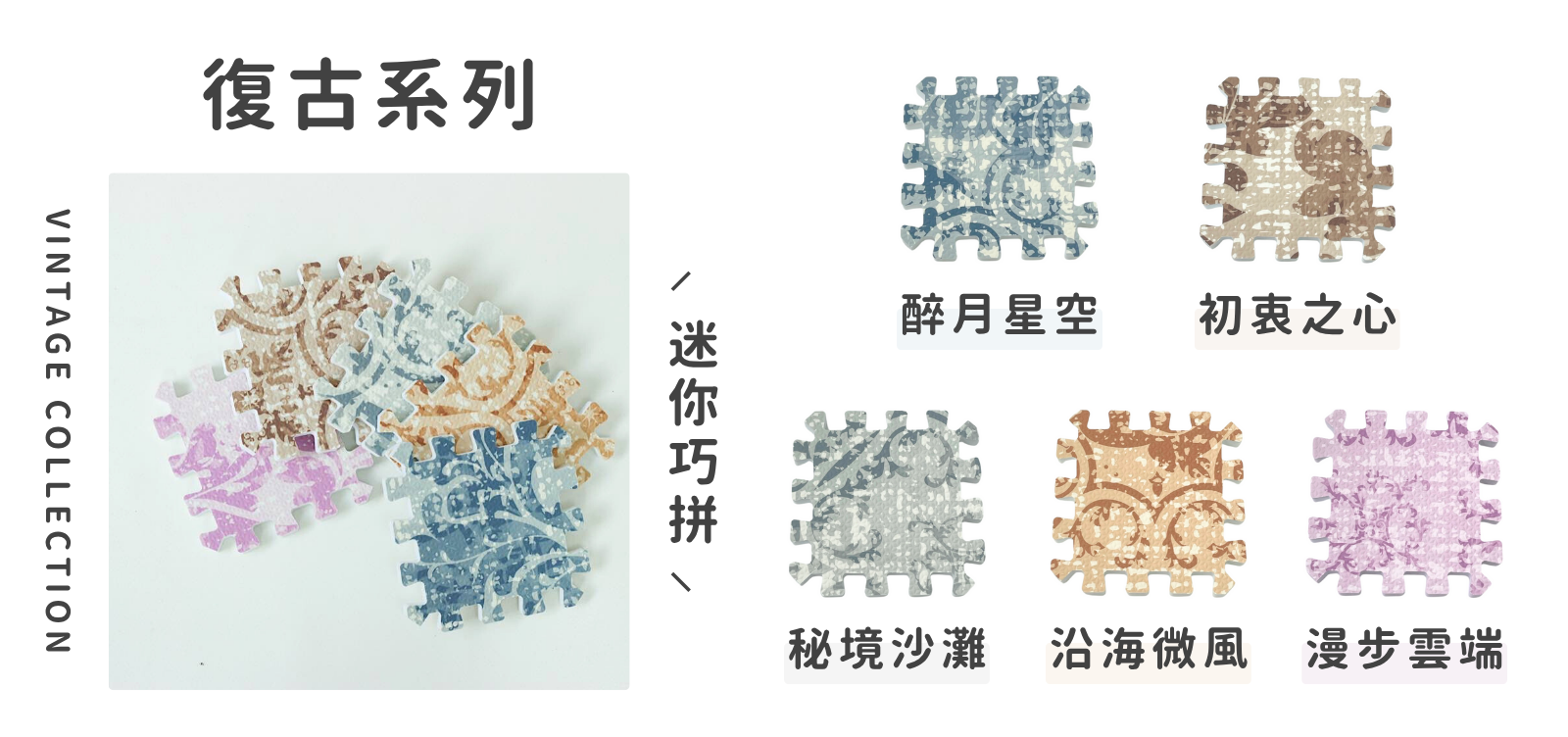 「復古系列」迷你巧拼,經典色調與紋理凝縮於小巧設計,靈活點綴空間,營造懷舊優雅氛圍。