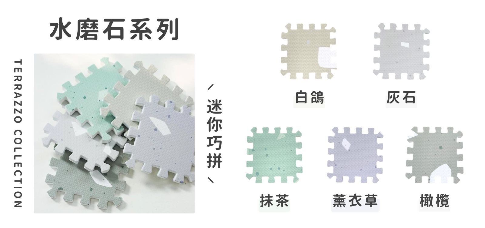「水磨石系列」迷你巧拼,經典斑點紋理結合復古與現代美感,細膩質感輕鬆點綴空間,展現獨特層次與個性。
