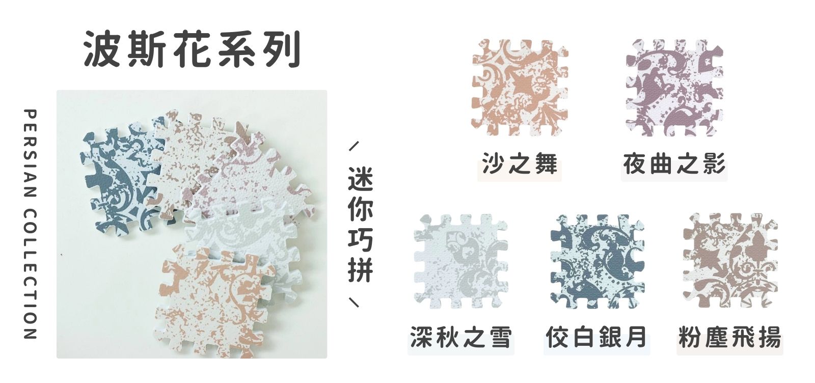 「波斯花系列」迷你巧拼,融入波斯地毯元素與柔和色調,精緻花紋象徵生命力與祝福,有著藝術韻味與溫馨氛圍。