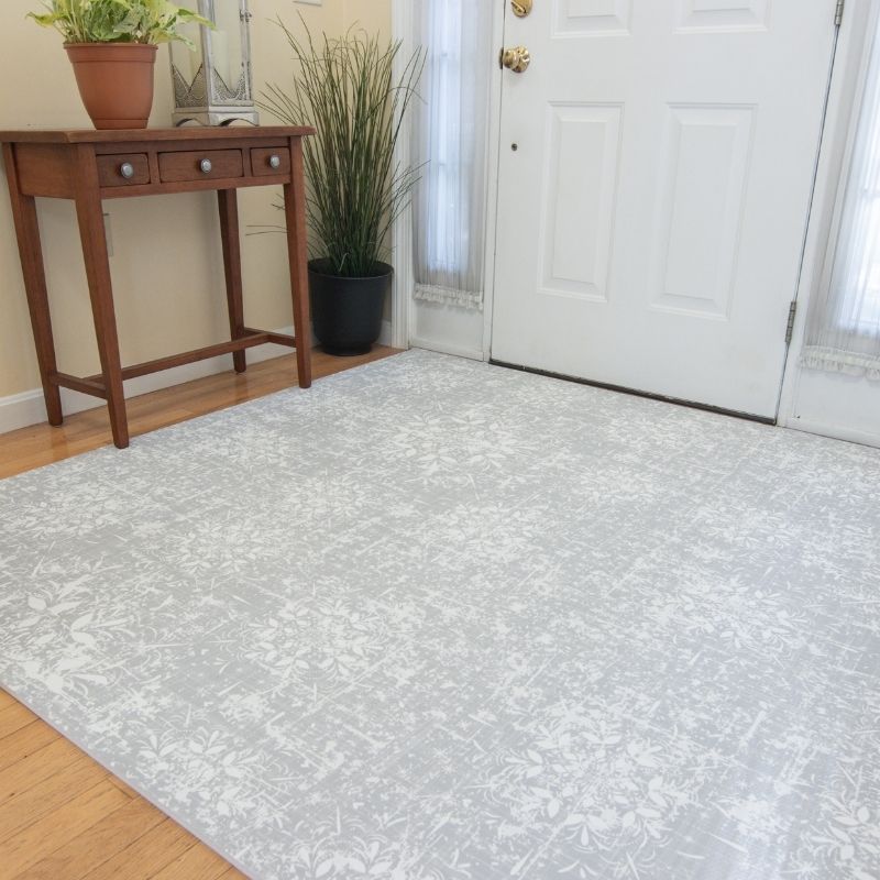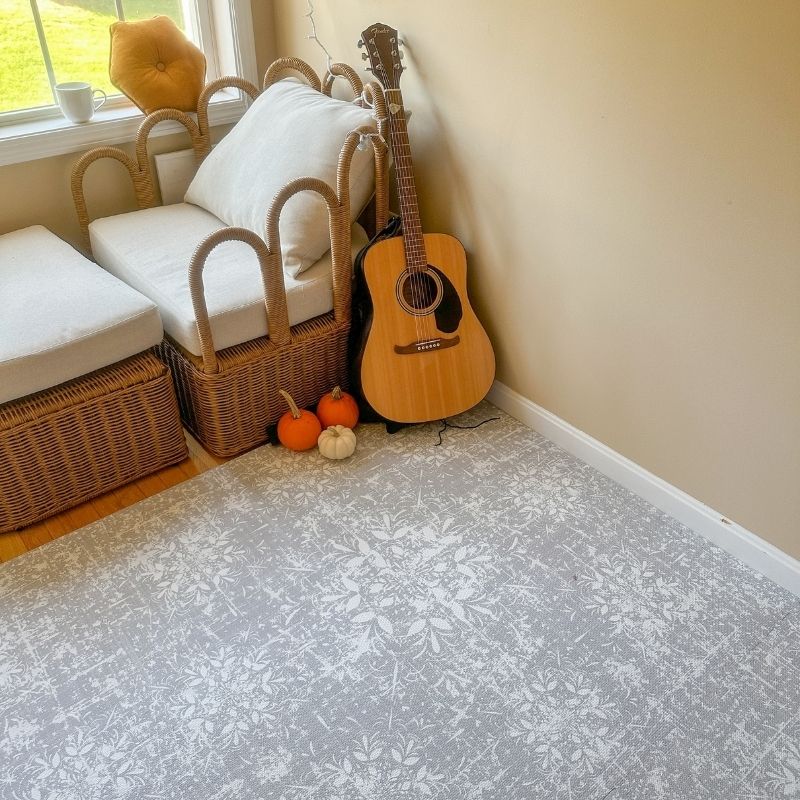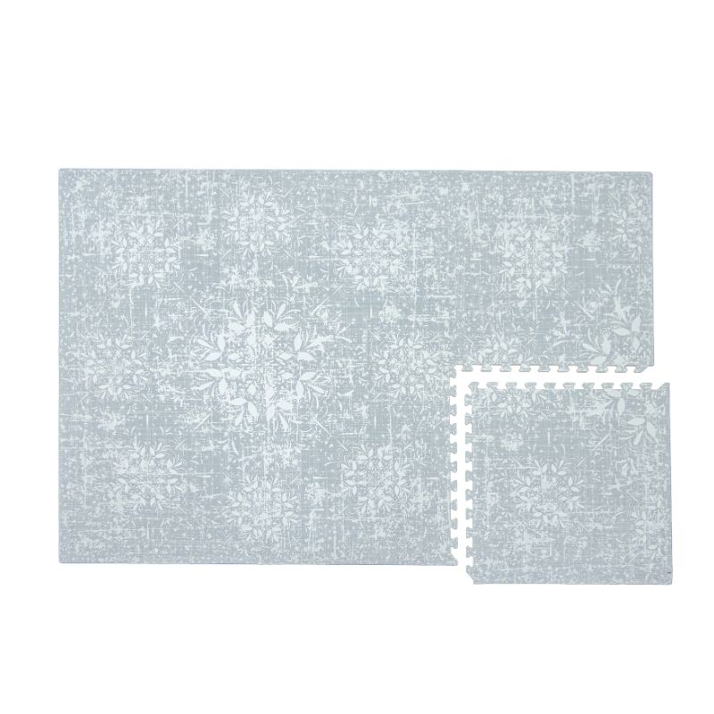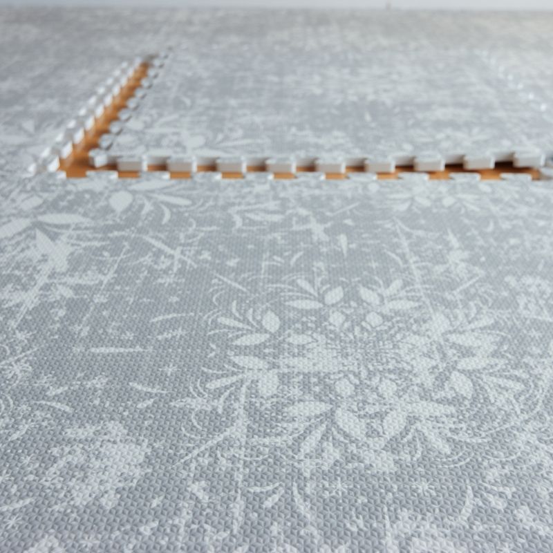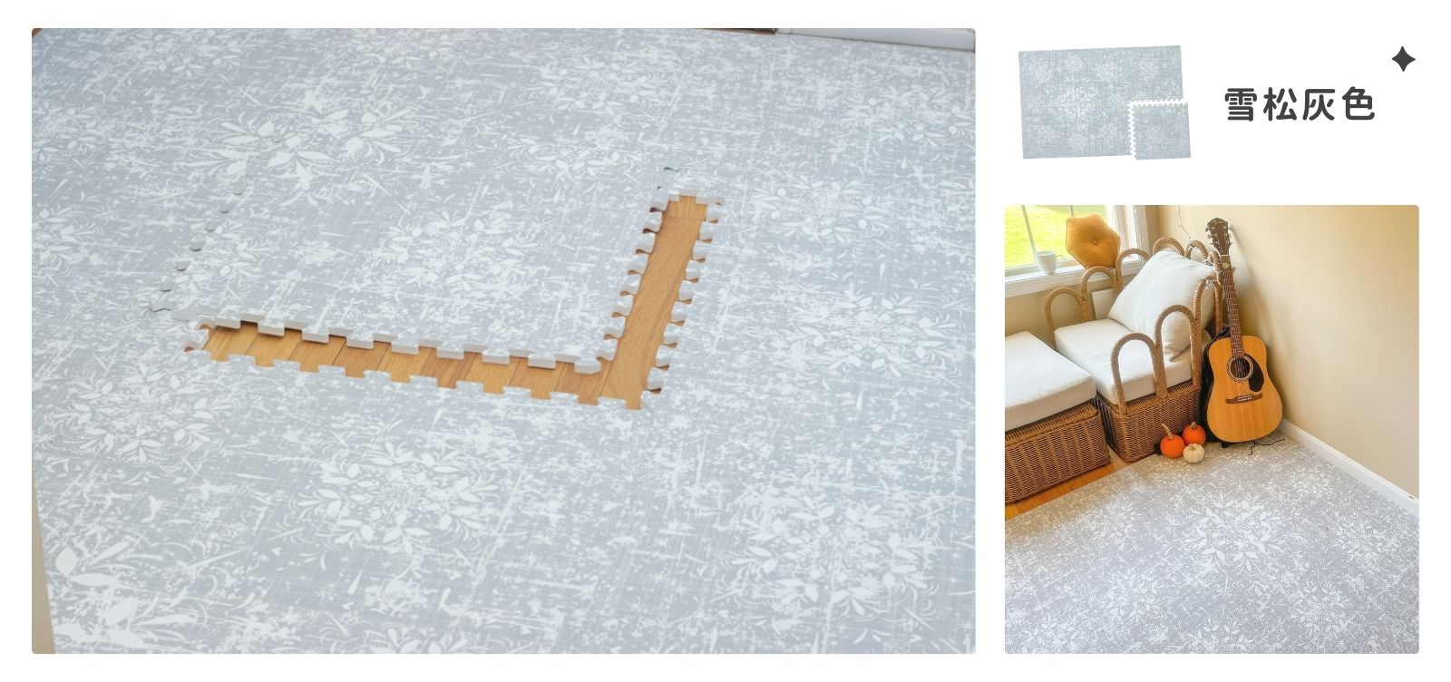 初雪紛飛」巧拼地墊,以雪松灰為主色調,搭配精緻手繪花紋,勾勒出冬日初雪飄落的靜謐與純淨之美。