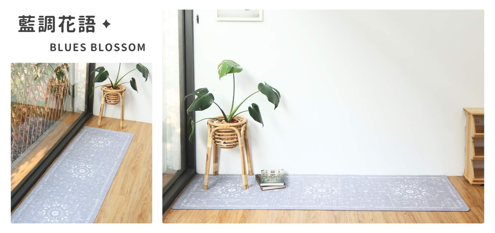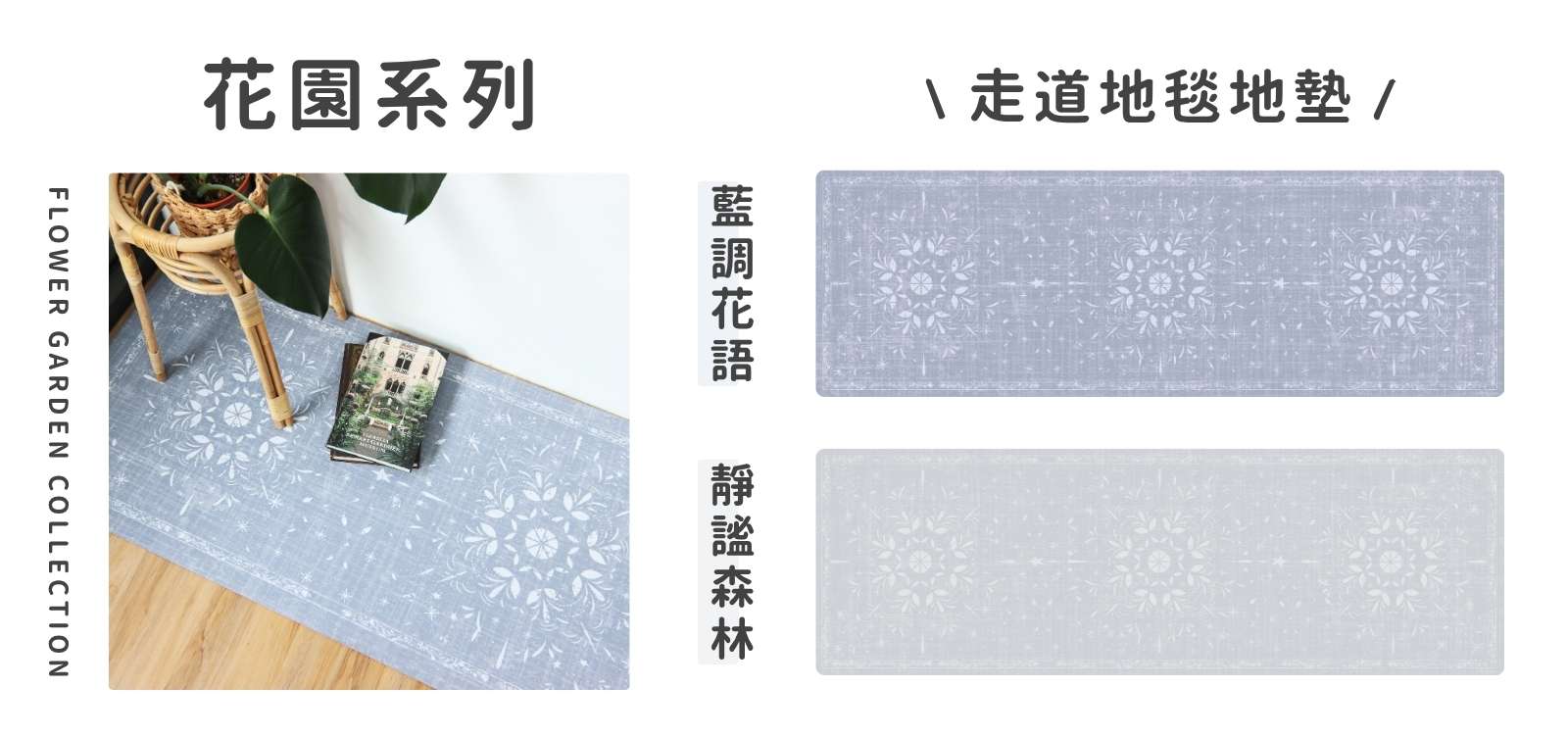 「藍調花語」走道地墊,對自然與和諧的追求,以灰藍色為主調,象徵著天空的深邃和海洋的寧靜,融合了花朵的柔美與生命力,營造出一片優雅輕盈的氛圍。