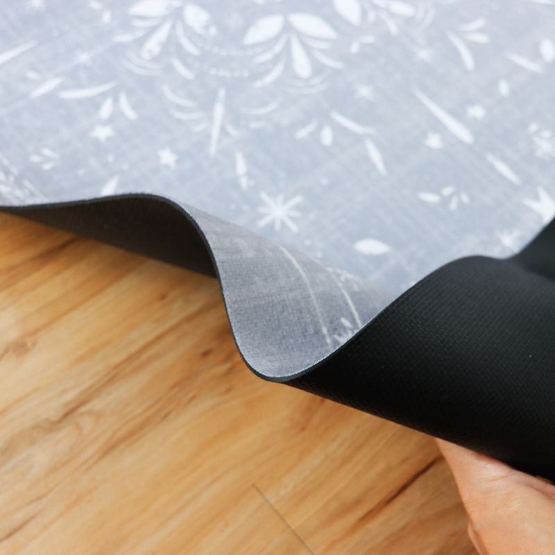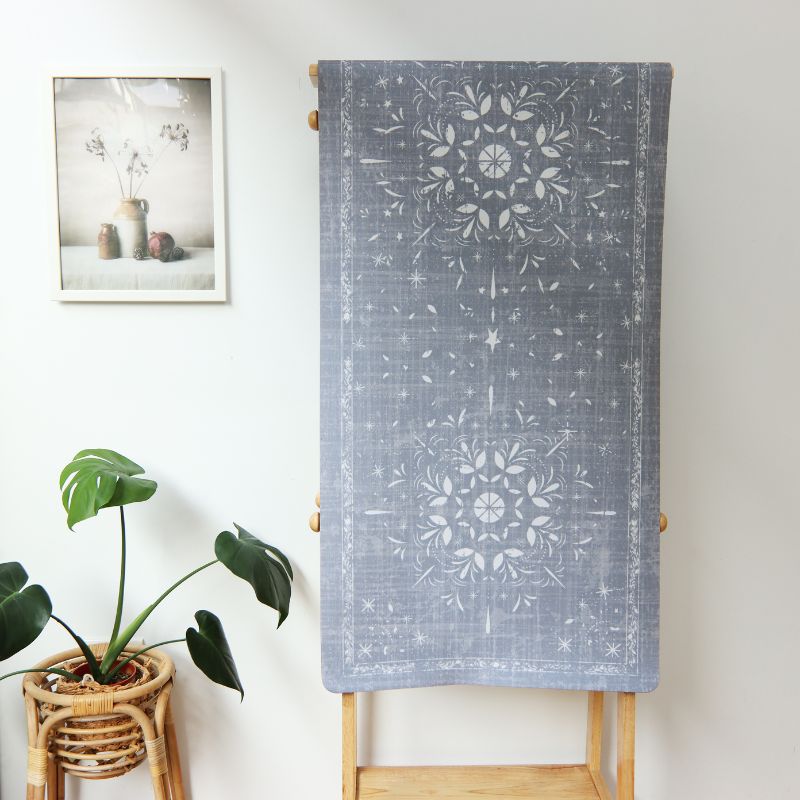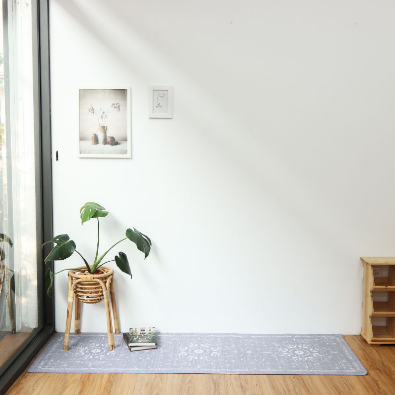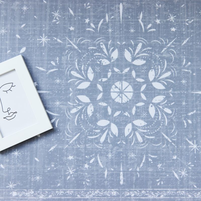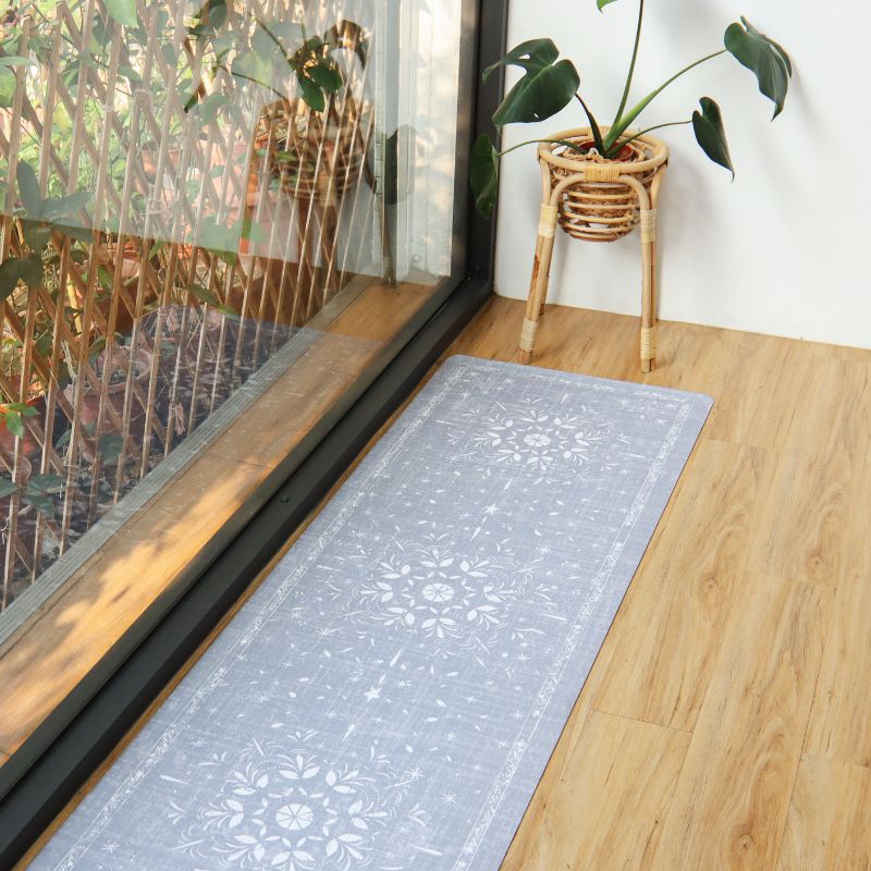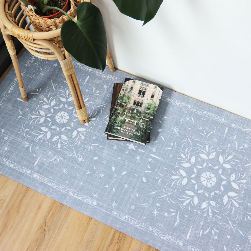 「藍調花語」走道地墊,以灰藍色調為主,營造出柔和的氛圍;其中央盛開的大花宛如一幅優雅的花卉畫作,散發迷人的美感,而周圍點綴的小花則像是星星般閃爍,為家居空間帶來愉悅和生機,成為生活中的一道亮麗風景。