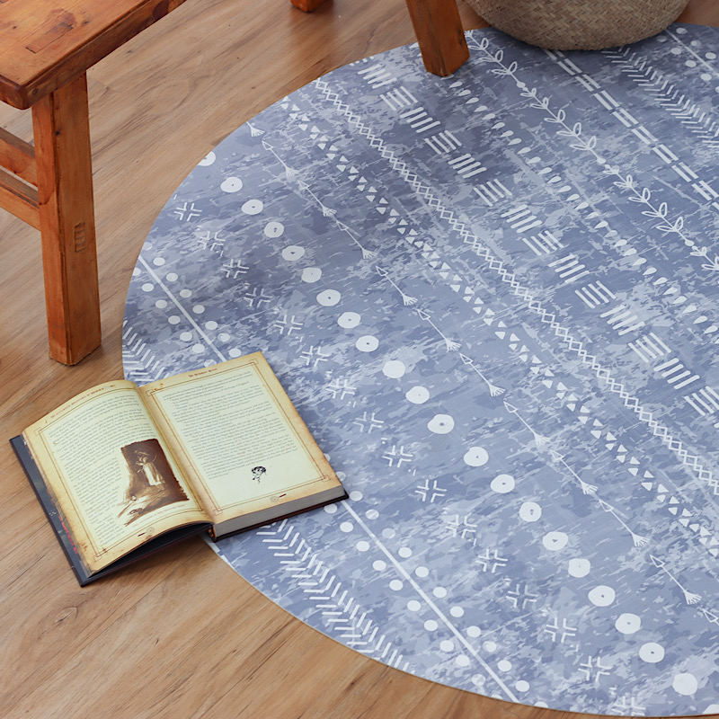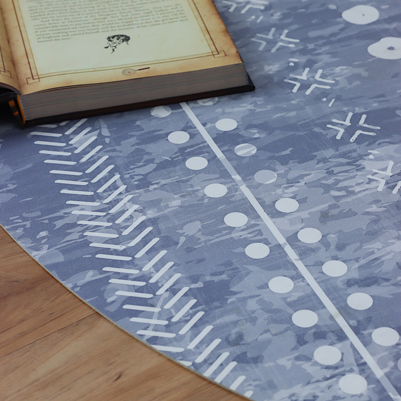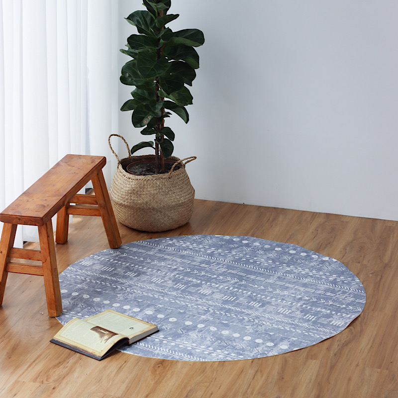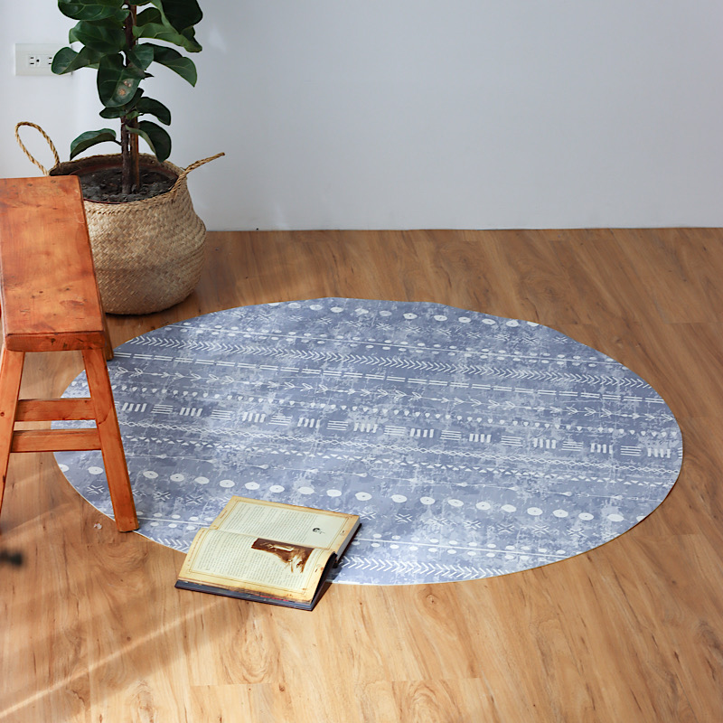 「夏日風情」圓形皮革地墊,設計靈感來自夏季的清爽與自由,藍灰色的底色宛如海洋與天空的融合,帶來視覺上的清涼感受。