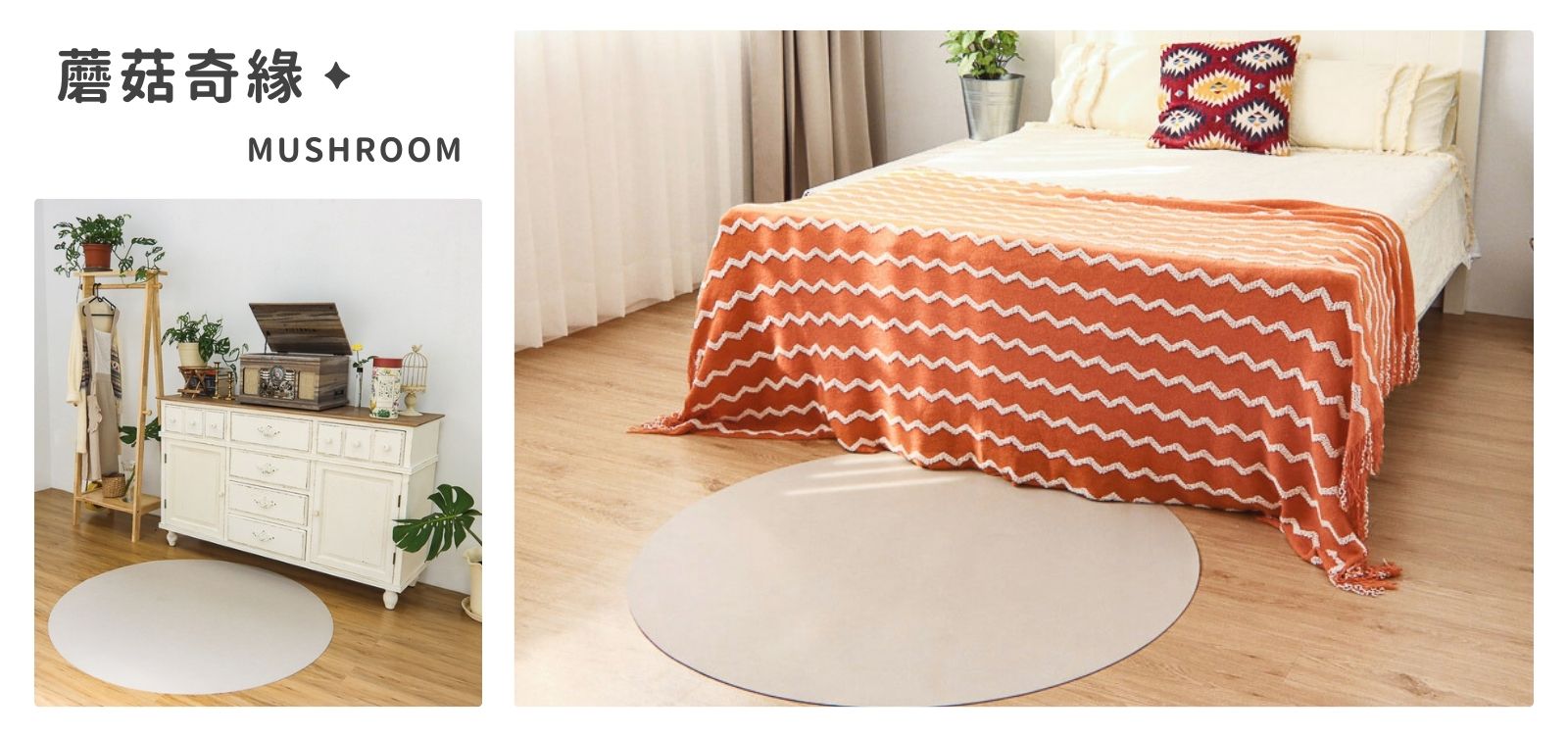 「蘑菇奇緣」圓形皮革地墊,靈感來自森林中的蘑菇王國,米色調如森林地面上的柔和光線,營造出溫暖自然的氛圍,增添一份童話般的奇幻與夢幻。