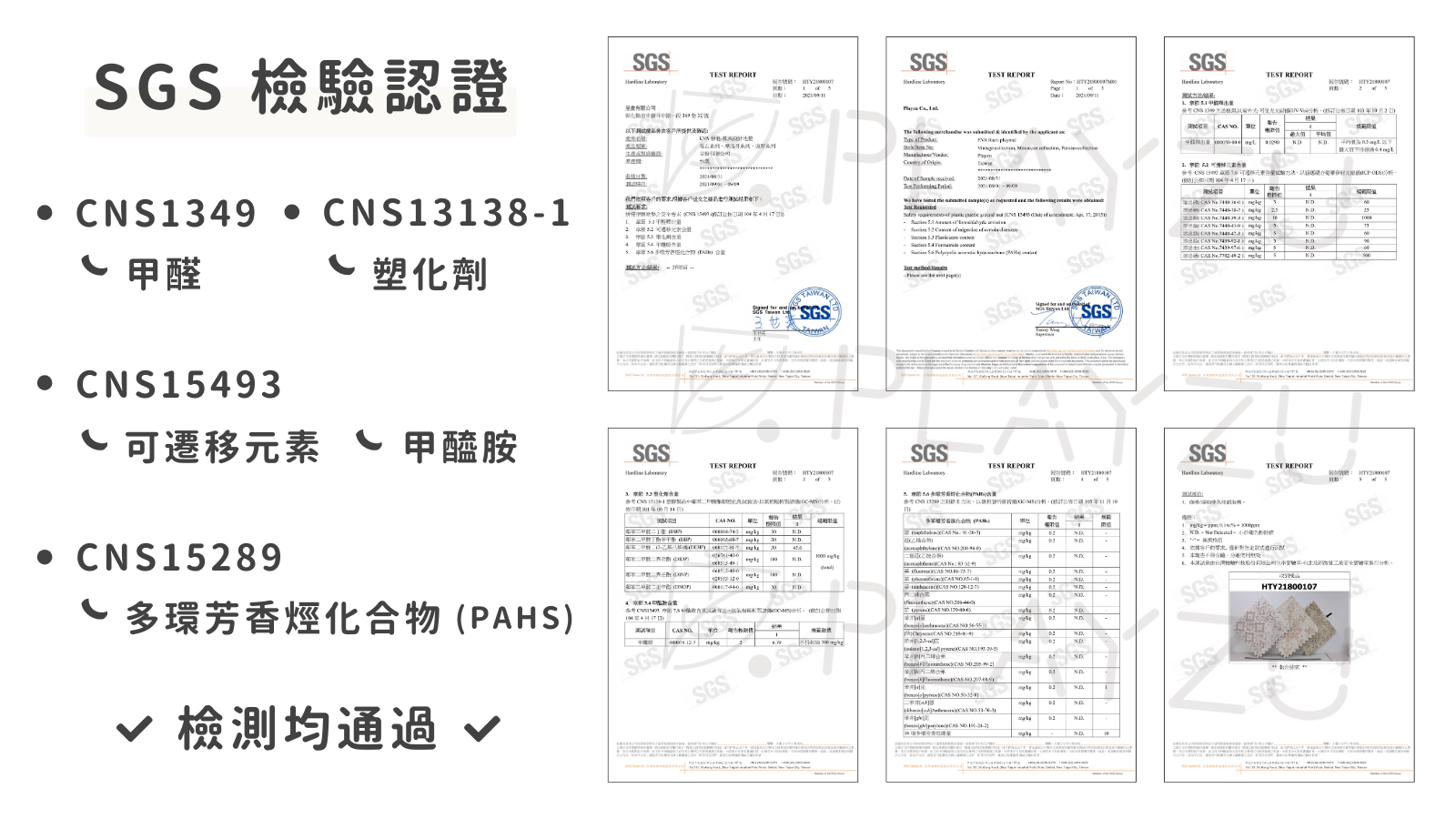 PLAYZU 巧拼地墊由高品質 EVA 發泡材質製成,並嚴格遵守台灣之安全標準全程於台灣進行生產。 當今台灣擁有世界上最嚴格的玩具安全標準,故 PLAYZU 致力於無毒發泡產品的研發、設計、生產,而為提供給消費者最高品質之產品,PLAYZU 產品除了符合最嚴格之台灣安全標準(CNS 15493、CNS 4797),也符合歐洲兒童玩具安全標準(EN-71、REACH)與國際安全標準(ASTM F963、CA65)。經第三方實驗室測試,檢測項目包括機械和物理性能、易燃性、甲酰胺、塑化劑(鄰苯二甲酸酯)、重金屬、PAHs、甲醛、BPA 等項目。因此,您可以安心且放心地使用 PLAYZU 之產品。