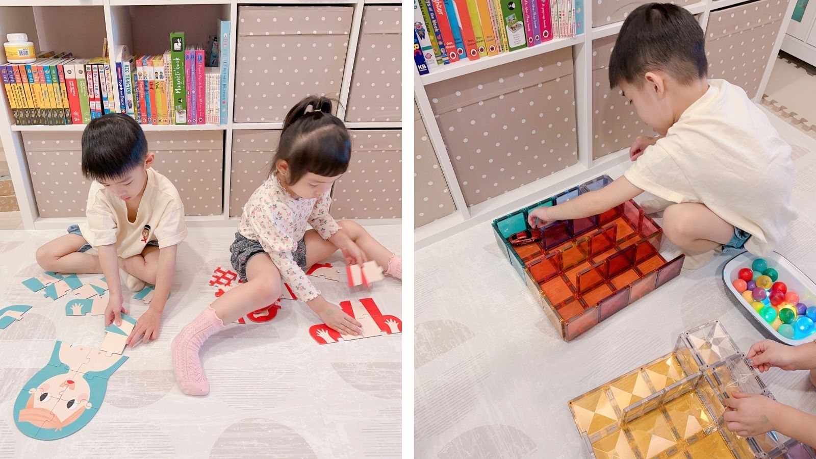 將巧拼地墊拼接成一個「遊戲島」,讓孩子專注於創意活動。