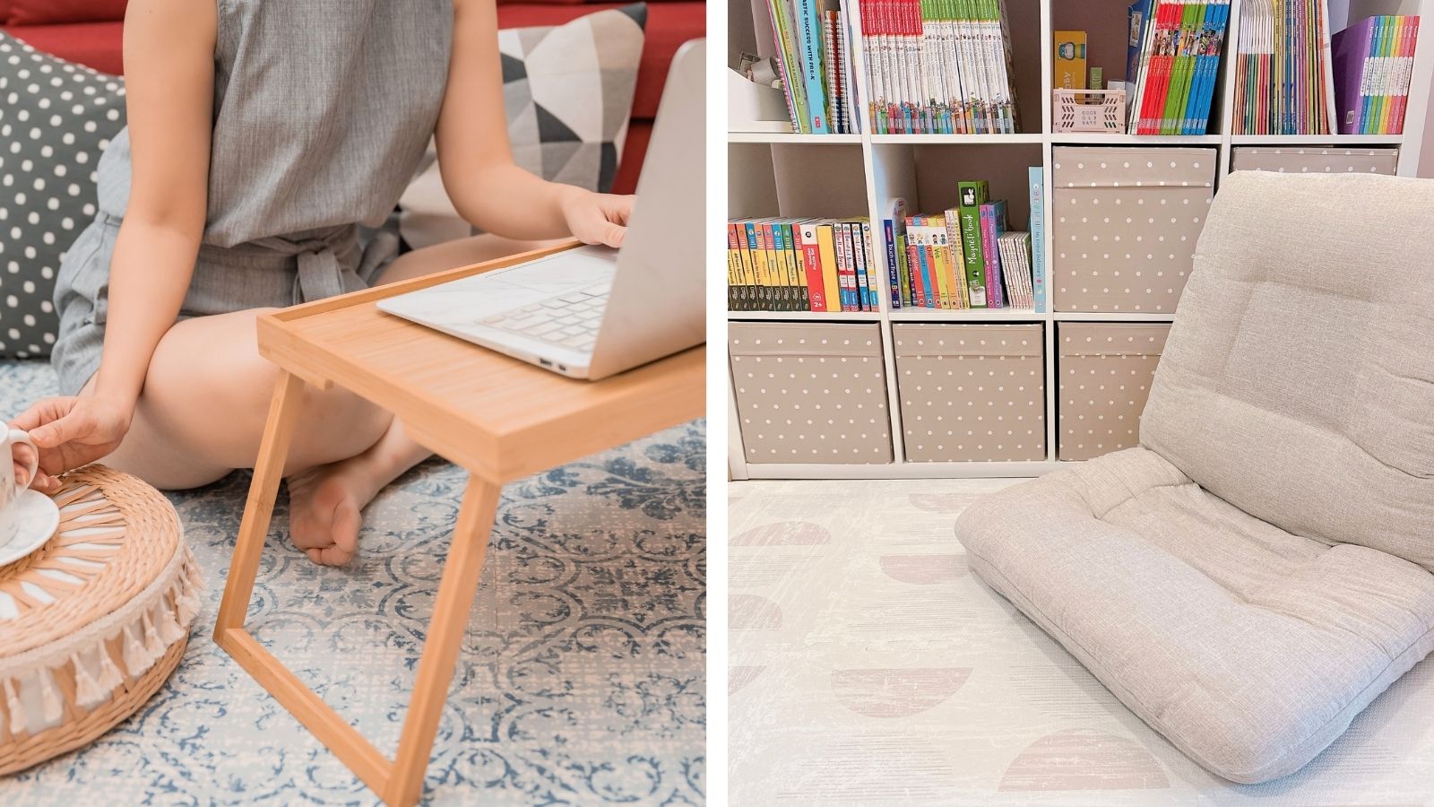 結合小茶几與落地燈,讓地墊區成為閱讀或放鬆的理想場所。