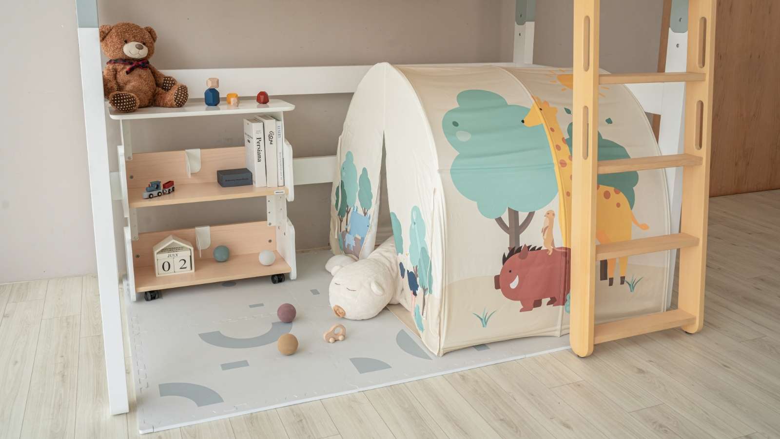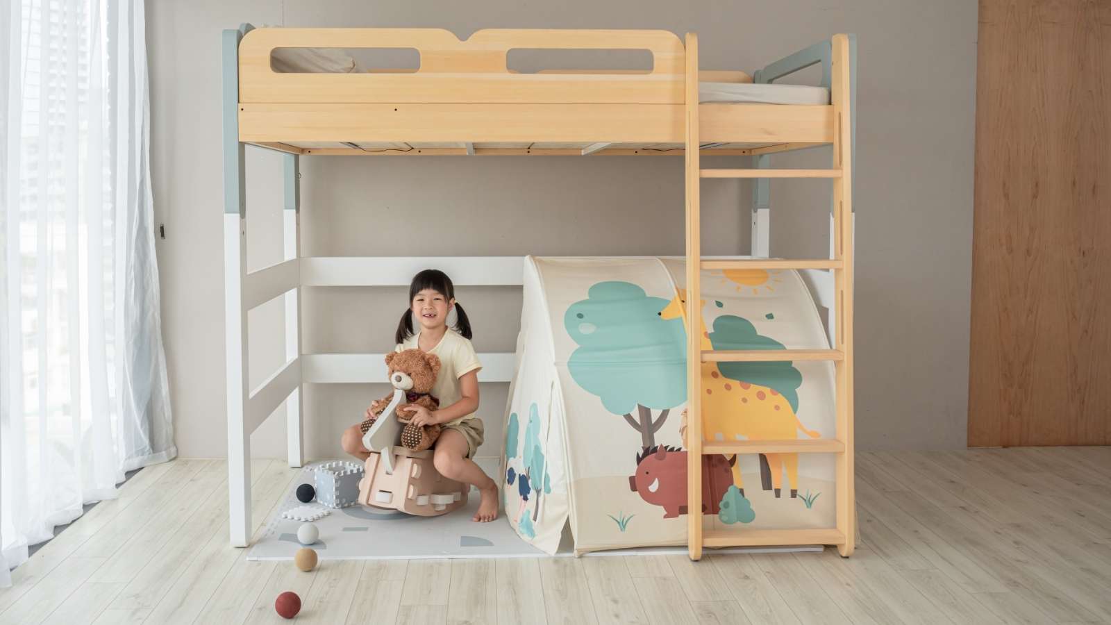 高架床的床下空間是最具潛力的創意區域,可以利用 HUGGE 檜木兒童床的下方空間,結合 PLAYZU 巧拼地墊,並擺放上益智玩具或育兒用品等,如 PLAYZU 的迷你巧拼、搖搖馬及玩具瑜珈球,也可以擺放亞梭的遊戲帳篷,讓孩子擁有一個私密的小天地;在帳篷裡,孩子可以盡情地閱讀、玩玩具,或者靜靜地思考,這種半封閉的小空間能給予孩子一種特有的安全感。這樣的設計不僅提升了房間的坪效,還讓孩子擁有更多的探索樂趣。
