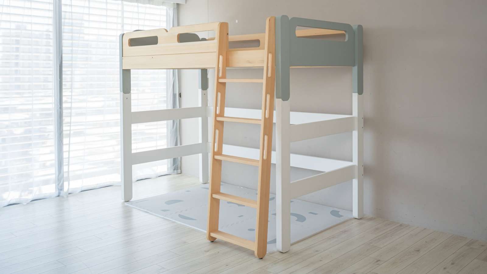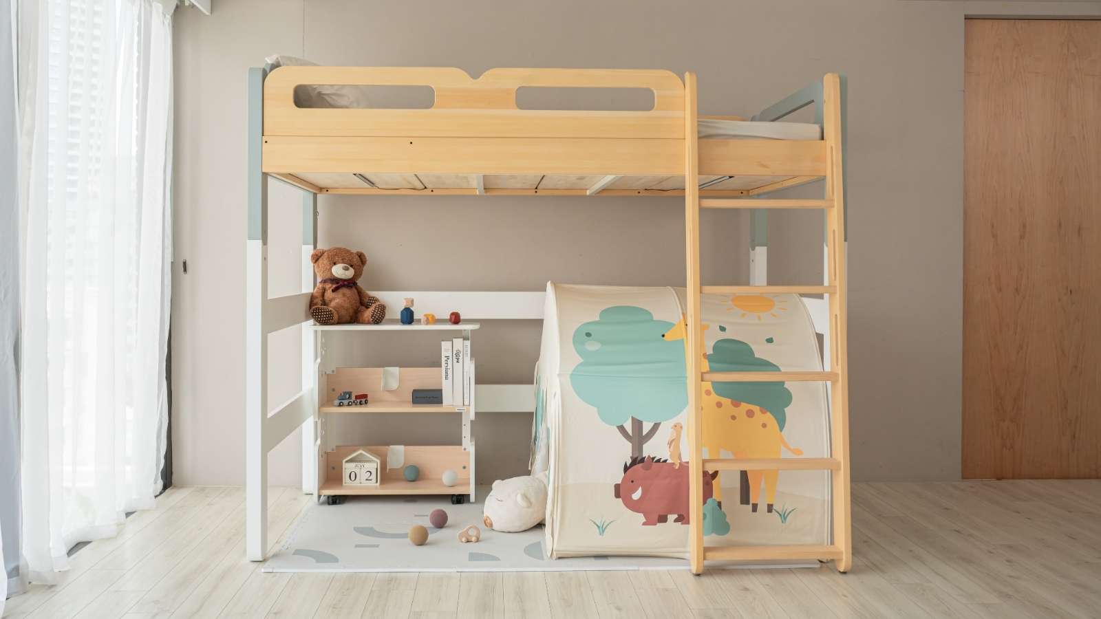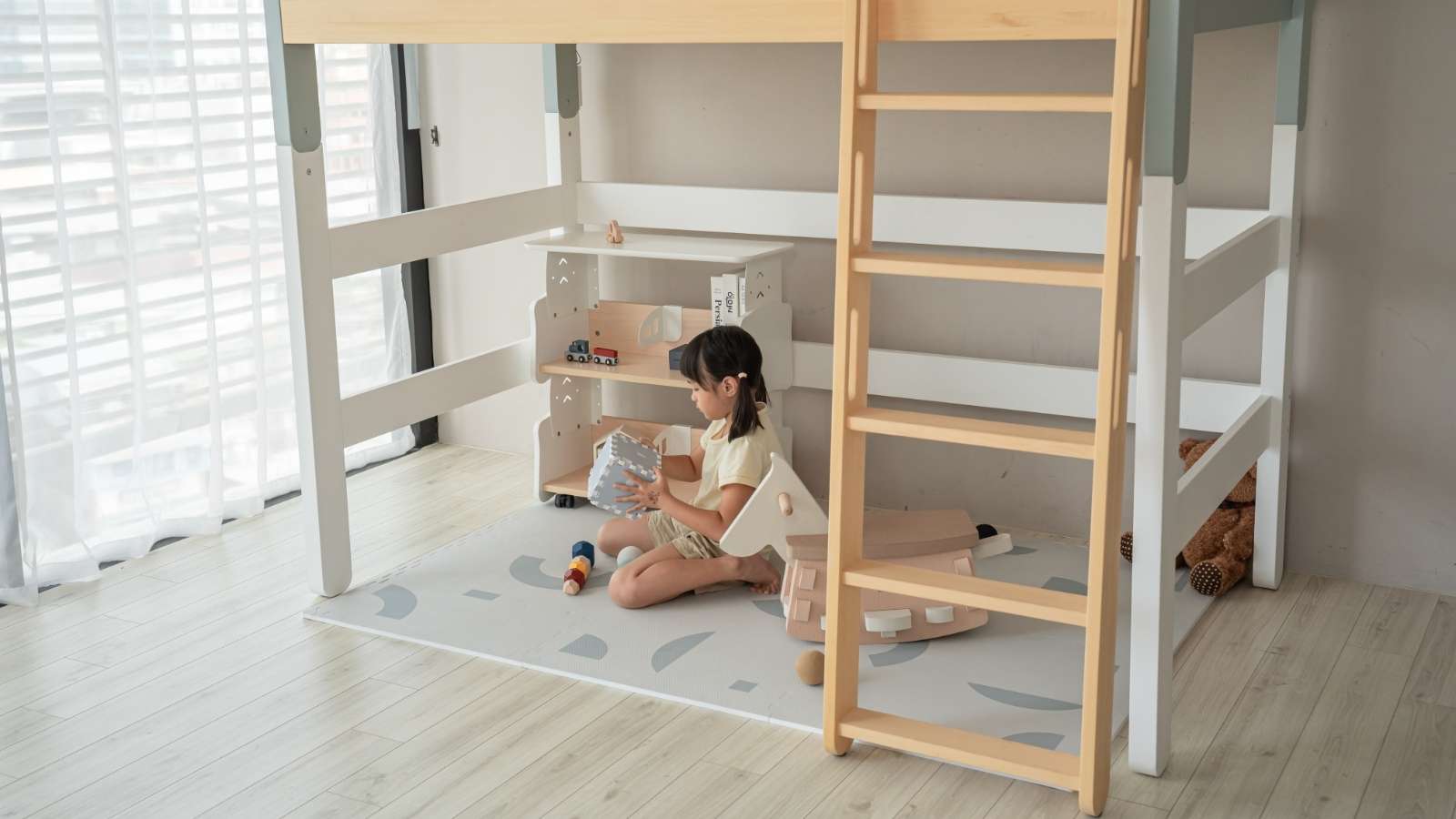 HUGGE 檜木兒童床的高架設計將睡眠區域上移,釋放了床下的空間,可以靈活運用為遊戲區、閱讀角或收納區,讓每一寸空間都得以充分利用;對於小坪數的房間來說,高架床的設計有效提升了空間的多功能性,也為孩子提供了一個隱密又專屬的小天地,激發他們的創意和探索精神,讓孩子擁有更多的活動空間。