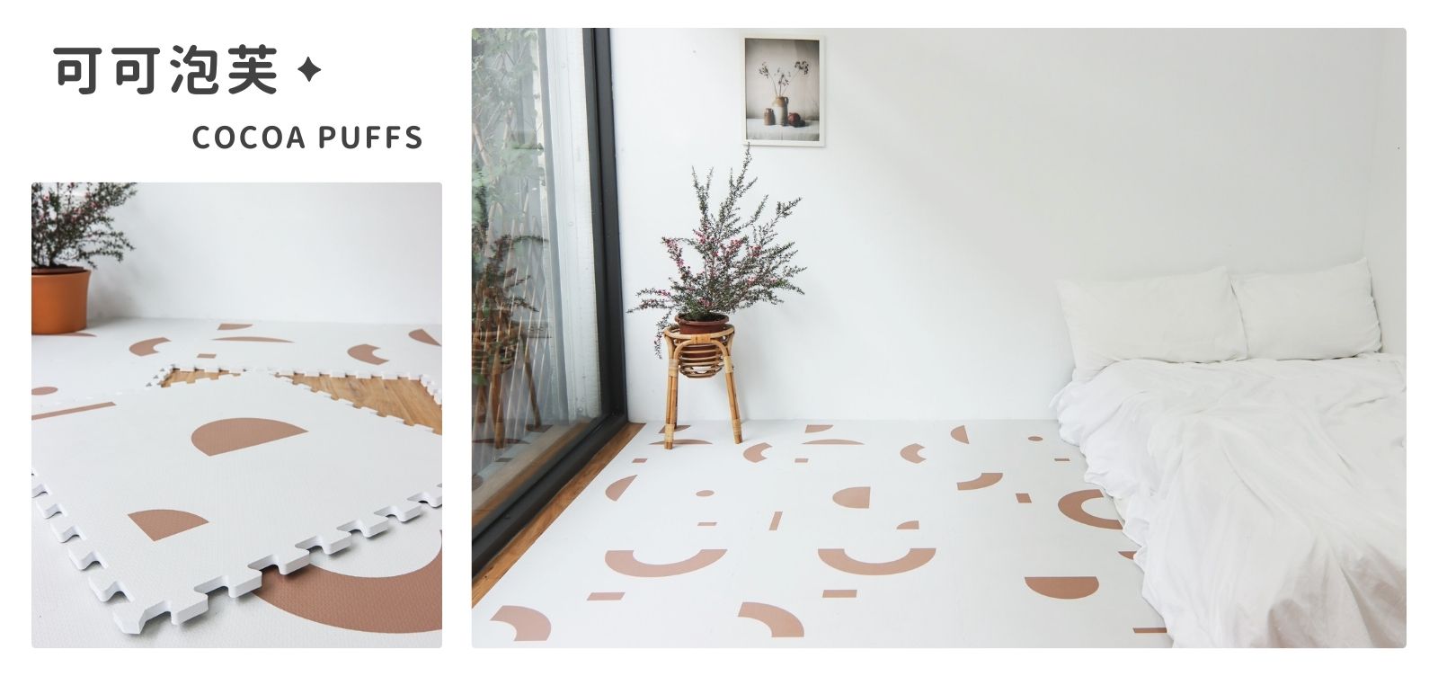 「可可泡芙」巧拼地墊,融合霧白底與藕咖色幾何,如家中飄香的美味回憶。