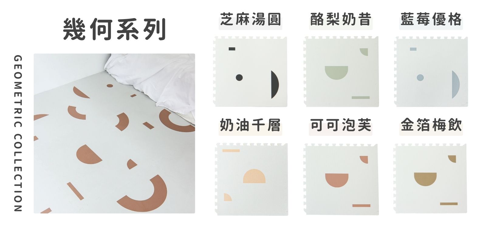 融合了現代感和抽象美學的「幾何系列」巧拼地墊,以多樣化的不規則圖案組成,表達出父母多元的生活方式和孩子們獨特的遊戲觀;其極簡設計與實用功能完美結合,提供柔軟又安全的遊戲空間,同時兼具時尚裝飾感,與家居搭配無縫,為家庭帶來樂趣與安心感。