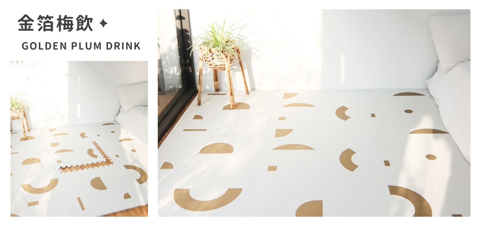 「金箔梅飲」巧拼地墊,融合了溫暖的霧白底色和華麗的亞麻金色幾何圖案,宛如奇幻仙境般迷人。