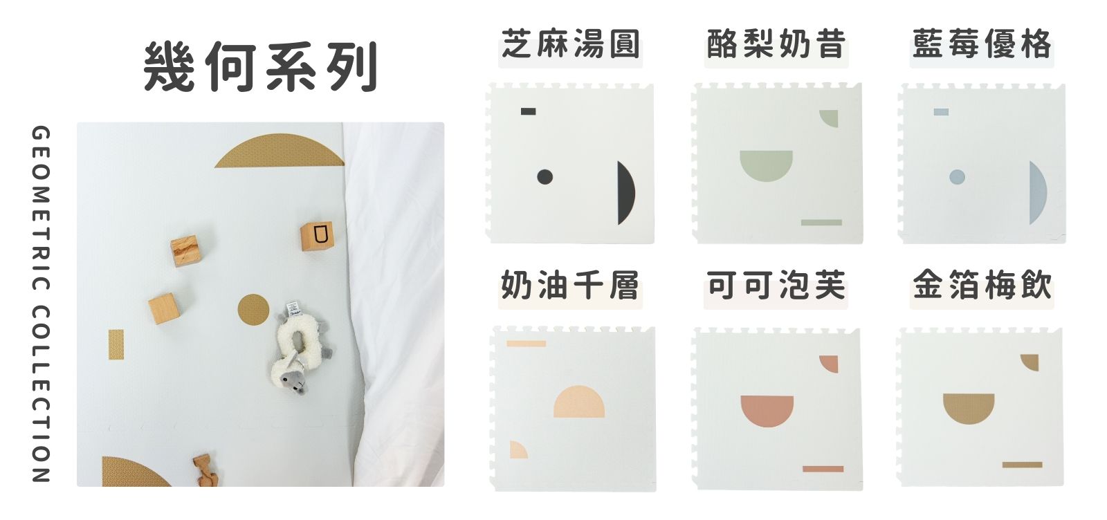 融合了現代感和抽象美學的「幾何系列」巧拼地墊,以多樣化的不規則圖案組成,表達出父母多元的生活方式和孩子們獨特的遊戲觀;其極簡設計與實用功能完美結合,提供柔軟又安全的遊戲空間,同時兼具時尚裝飾感,與家居搭配無縫,為家庭帶來樂趣與安心感。