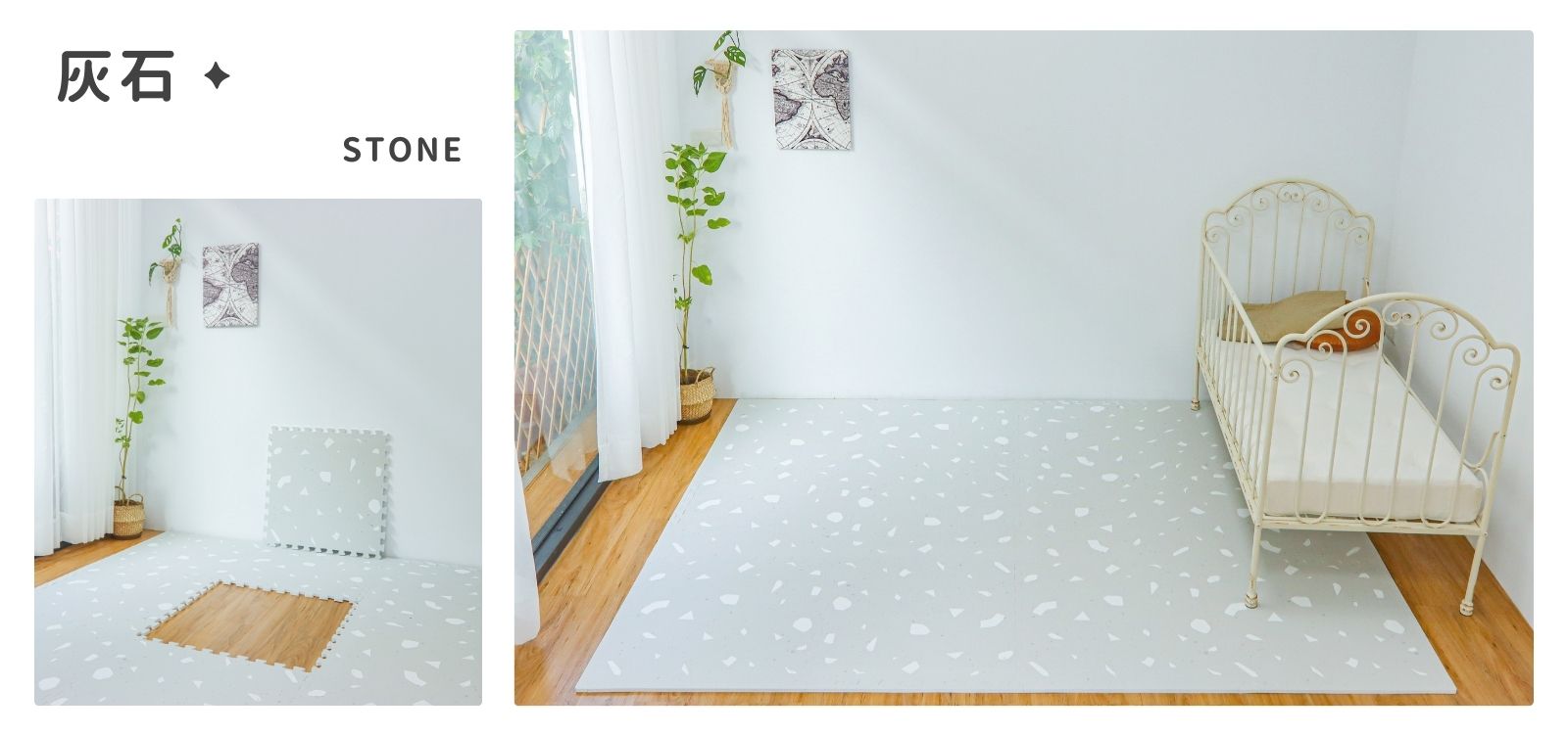 「灰石」巧拼地墊,以淺灰色呈現石材的純粹質感,簡約而優雅,低調而不失格調。