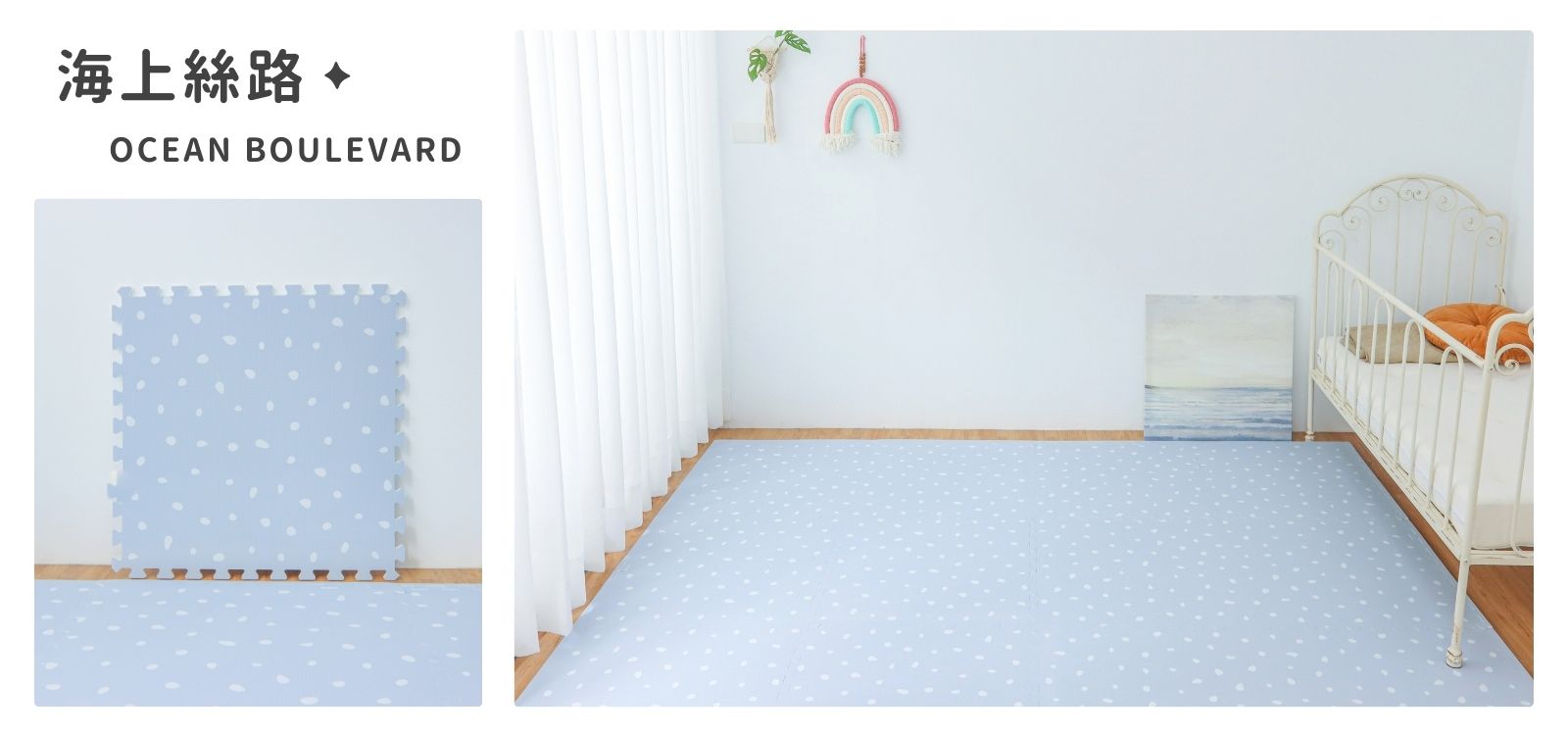 「海上絲路」巧拼地墊,以淺藍色為主,結合童趣波爾卡圓點設計,彷彿航行於絲綢之路的悠揚海洋。