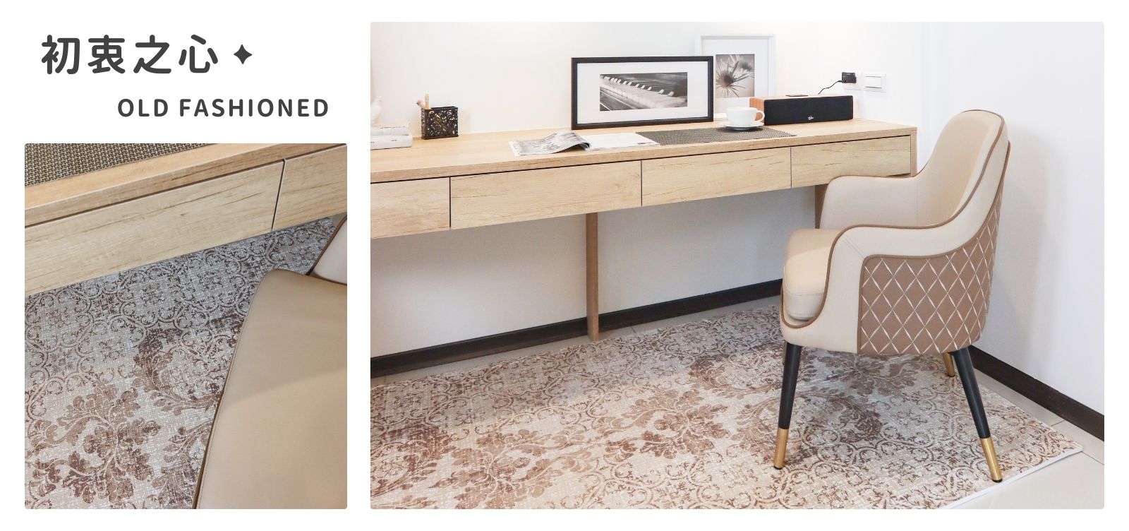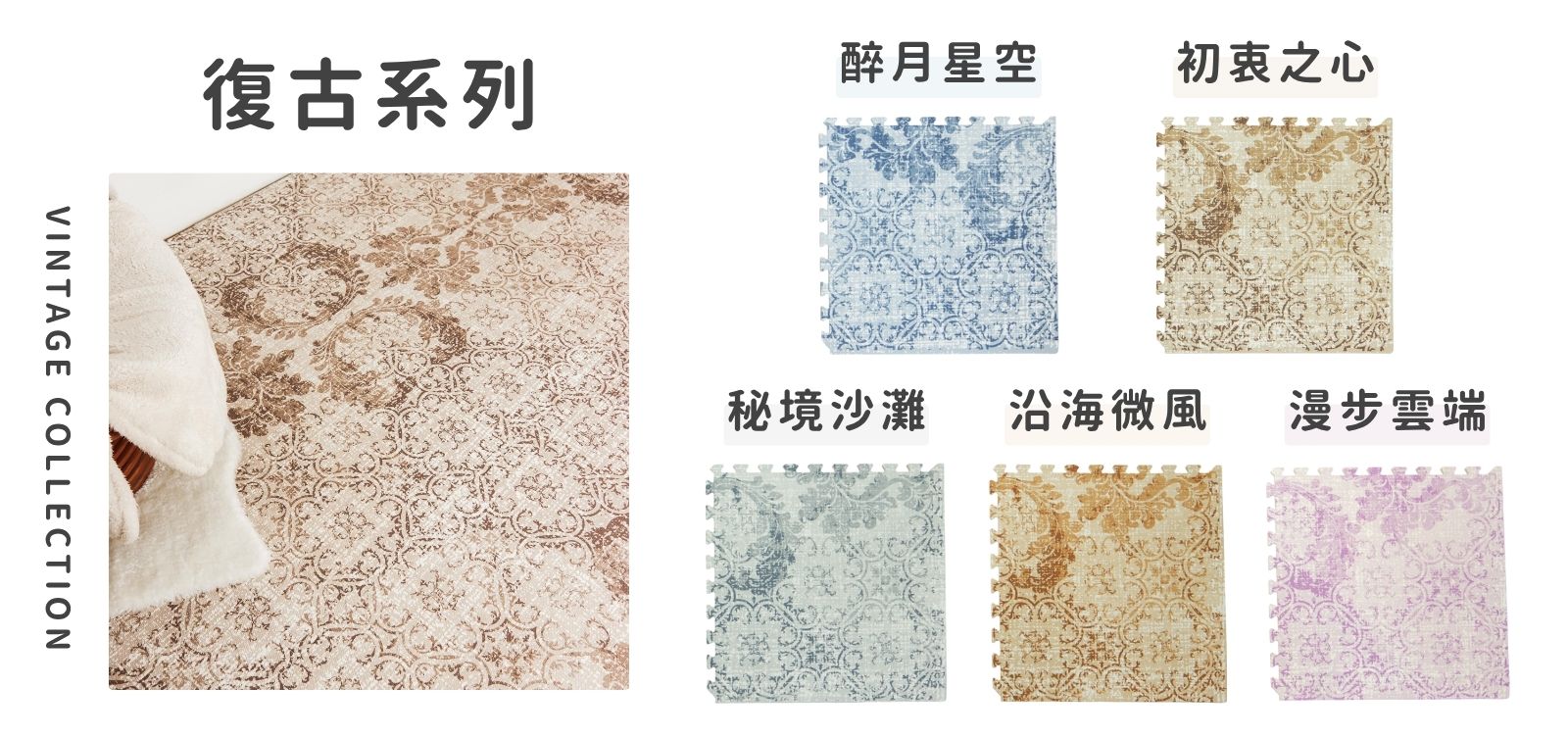 「復古系列」巧拼地墊,靈感源自經典時代的設計元素,融合懷舊的色調與細膩的紋理,呈現優雅與溫暖的氛圍;其復古花紋與線條美感相結合,為家居帶來時光流轉的獨特韻味,輕鬆營造舒適又富格調的空間。