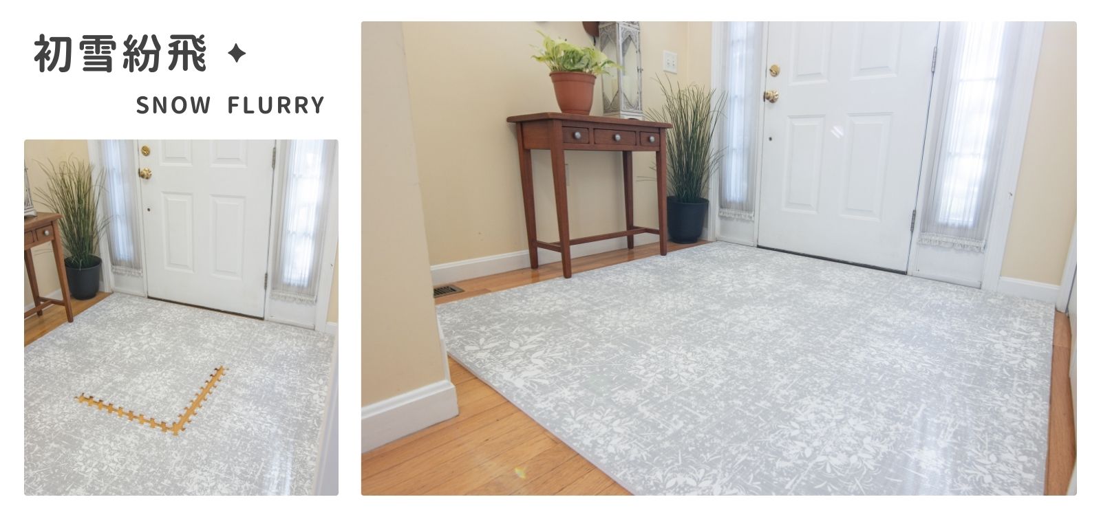 「初雪紛飛」巧拼地墊,以雪松灰為主色調,搭配精緻手繪花紋,勾勒出冬日初雪飄落的靜謐與純淨之美。