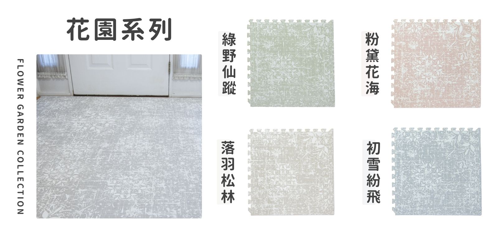 靈感源自自然與四季變化的「花園系列」巧拼地墊,以柔和色調與手繪花紋詮釋春、夏、秋、冬的獨特韻味與美感,如詩般呈現自然的變幻,猶如將四季流轉的花園融入家中,無論搭配任何裝潢風格,都能輕鬆帶來溫馨與和諧的氛圍。