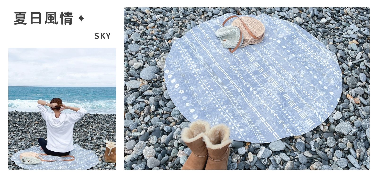 夏日風情」圓形皮革地墊,設計靈感來自夏季的清爽與自由,藍灰色的底色宛如海洋與天空的融合,帶來視覺上的清涼感受。