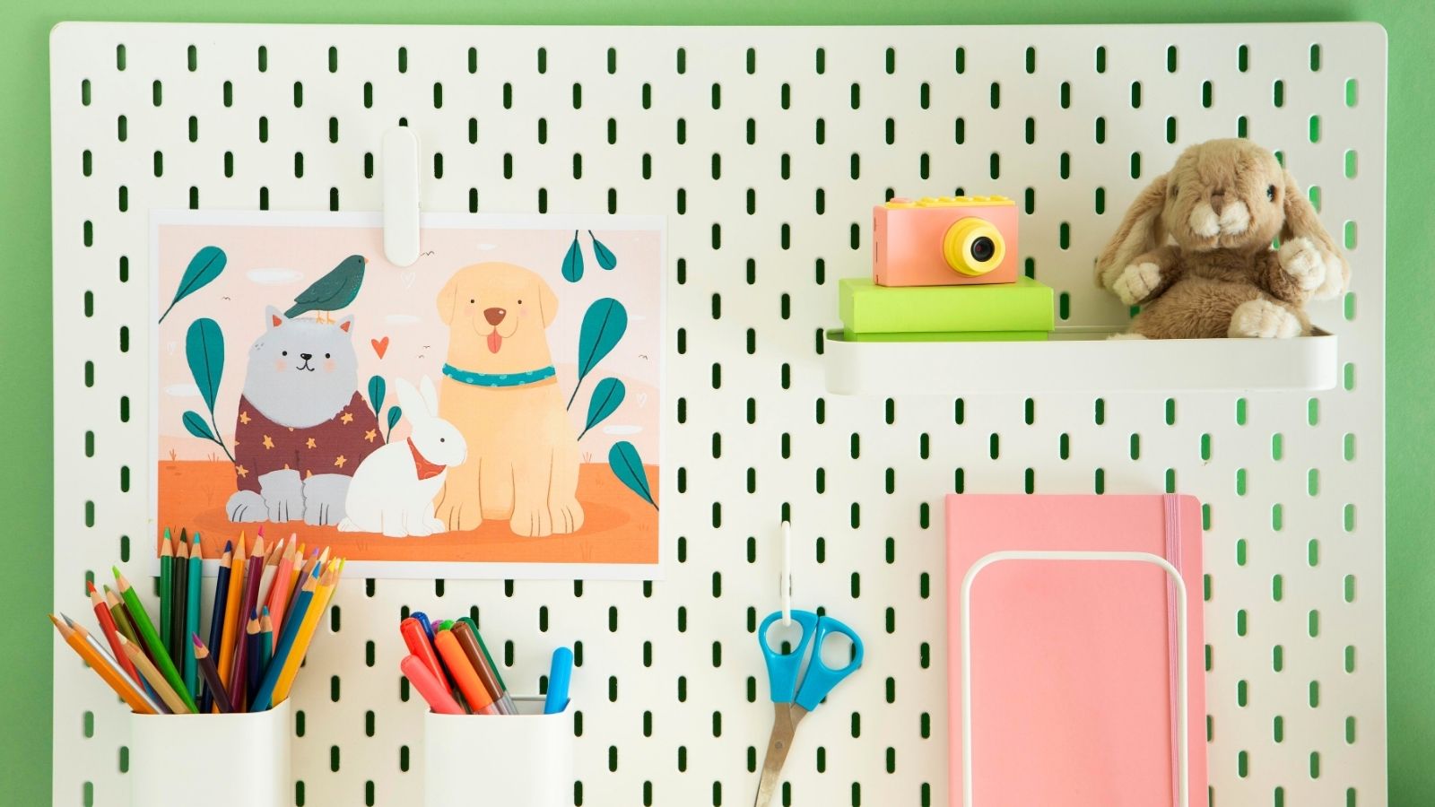 • 掛勾牆或洞洞板:收納輕巧配件、畫筆、工具類玩具超實用。
